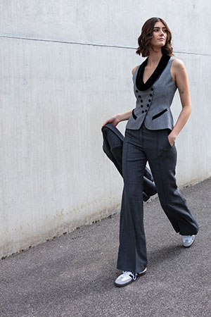 L’habit est produit selon les tailles standards, seule la longueur de l’habit et des manches est adaptée sur mesure. Cette méthode est moins coûteuse que la production sur mesure. Exemple: «le petit chemisier blanc» – un classique adapté à toutes circonstances.