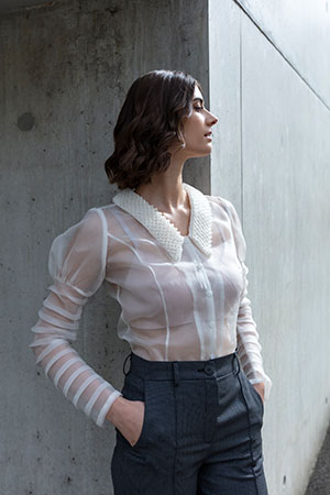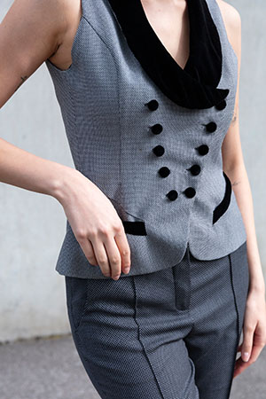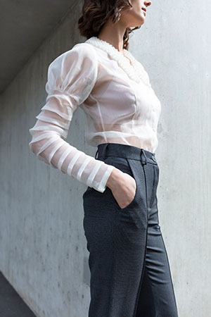 L’habit est produit selon les tailles standards, seule la longueur de l’habit et des manches est adaptée sur mesure. Cette méthode est moins coûteuse que la production sur mesure. Exemple: «le petit chemisier blanc» – un classique adapté à toutes circonstances.
